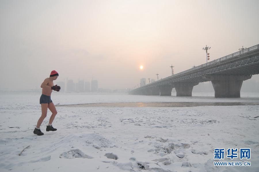 1月20日,一名冬泳爱好者在牡丹江市江滨公园跑步热身。当日是二十四节气中大寒,黑龙江省牡丹江市迎来小雪天气,当地健身爱好者不畏严寒、坚持锻炼,感受体育运动带来的快乐。 新华社发(张春祥摄)