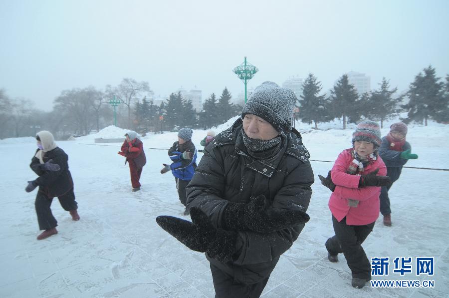 1月20日,人们在牡丹江市江滨公园健身。当日是二十四节气中大寒,黑龙江省牡丹江市迎来小雪天气,当地健身爱好者不畏严寒、坚持锻炼,感受体育运动带来的快乐。 新华社发(张春祥摄)