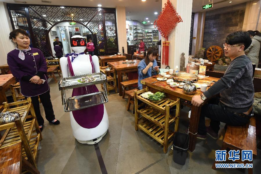 智能机器人在火锅店内送餐(1月11日摄)。近日,河南许昌一家火锅店引进一台智能机器人,在餐厅“跑堂”,吸引了众多市民游客前来“尝鲜”。据介绍,这台定制的智能机器人可以给客人送菜、唱歌助兴,价值8万余元。新华社记者 李博 摄
