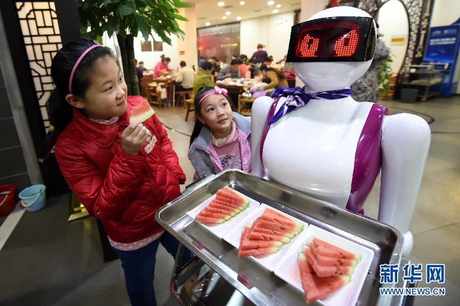 两位就餐的小朋友在观看智能机器人送餐(1月11日摄)。近日,河南许昌一家火锅店引进一台智能机器人,在餐厅“跑堂”,吸引了众多市民游客前来“尝鲜”。据介绍,这台定制的智能机器人可以给客人送菜、唱歌助兴,价值8万余元。新华社记者 李博 摄