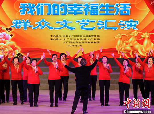 2月3日,河北省大厂回族自治县“我们的幸福生活”群众文艺汇演隆重举行,各族群众以自编自演的文艺节目,载歌载舞喜迎新春佳节的到来。据了解,为让各族群众过一个文化味十足的春节,大厂县从2014年12月31日至2015年3月6日的两个多月时间里,将组织举办“墨香满春”新春书市惠民活动、“贺新春”美丽大厂书画展、“我们的幸福生活”群众文艺汇演、传统花会展演和元宵节有奖灯谜等18项精彩纷呈的文化活动。