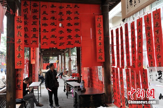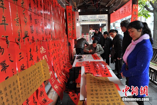 2月3日,福建省、福州市书法家协会的书法家在福州古街现场手写春联,受到民众青睐。中新社发吕明摄