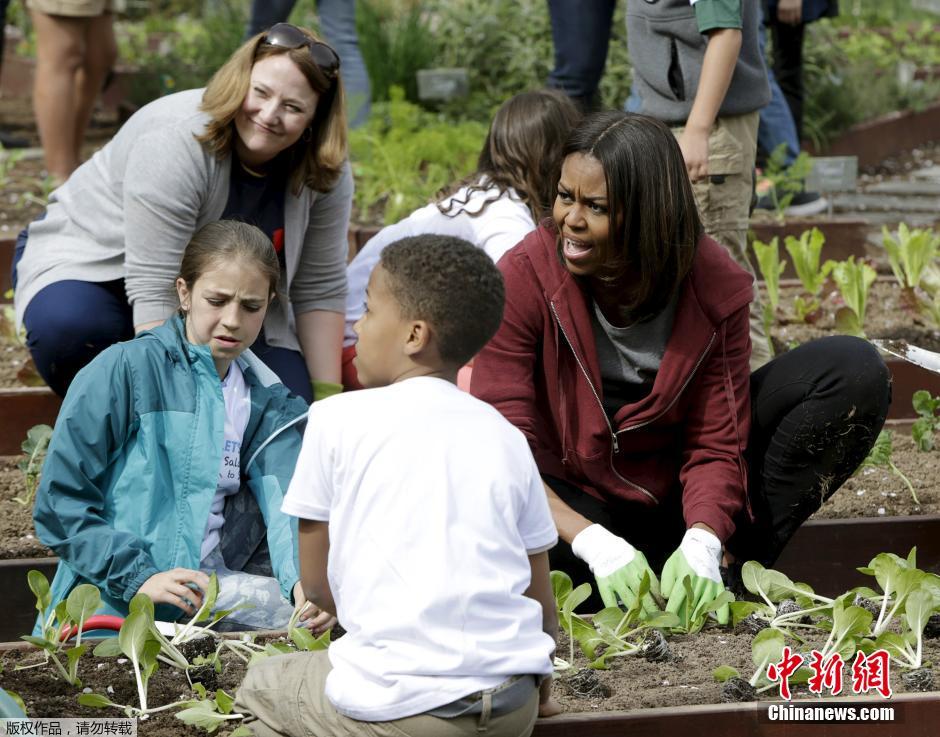 当地时间2015年4月15日,美国华盛顿,美国第一夫人米歇尔在白宫花园内种菜,鼓励民众健康饮食。