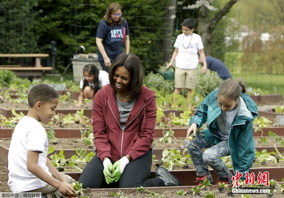 当地时间2015年4月15日,美国华盛顿,美国第一夫人米歇尔在白宫花园内种菜,鼓励民众健康饮食。
