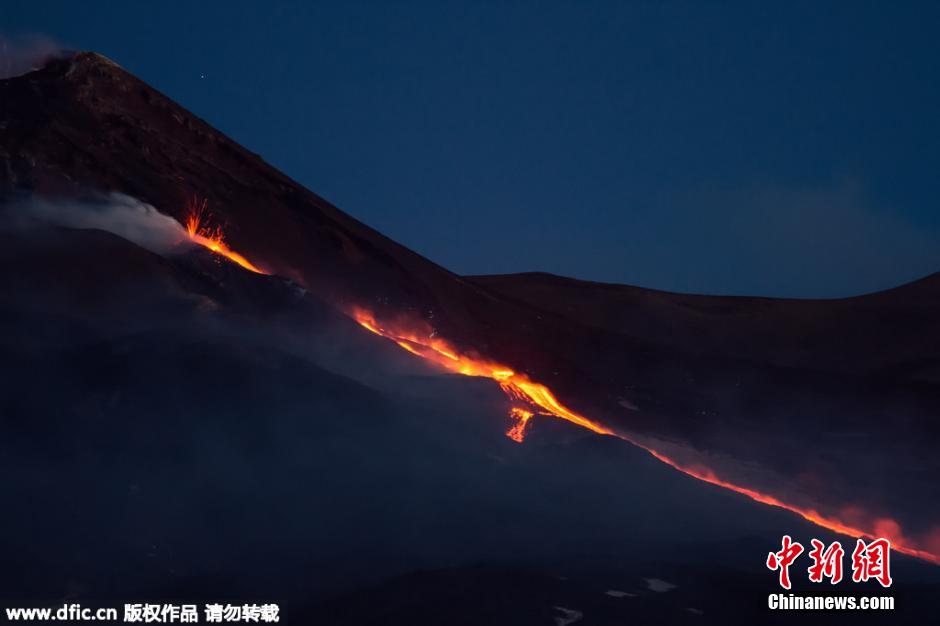 当地时间2015年5月14日,意大利西西里岛卡塔尼亚,埃特纳火山发生喷发,熔岩喷涌而出。