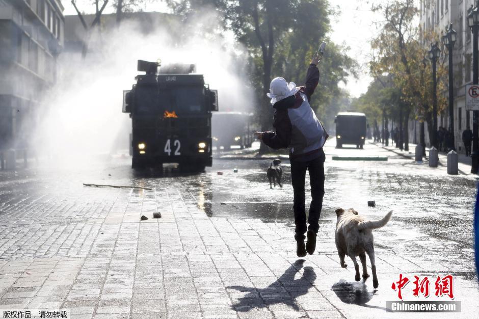 图为一名示威者向防暴警察车辆投掷瓶子。
