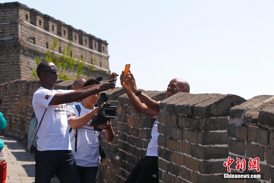 5月15日,时值2015北京田径世锦赛倒计时100天系列活动之际,国际田联派出了三位明星运动员科林·约翰逊,迈克·鲍威尔和迈克尔·约翰逊,来到北京助推2015北京田径世锦赛。图为在慕田峪长城上迈克尔·约翰逊(左一)为迈克·鲍威尔拍照。中新社发 富田 摄