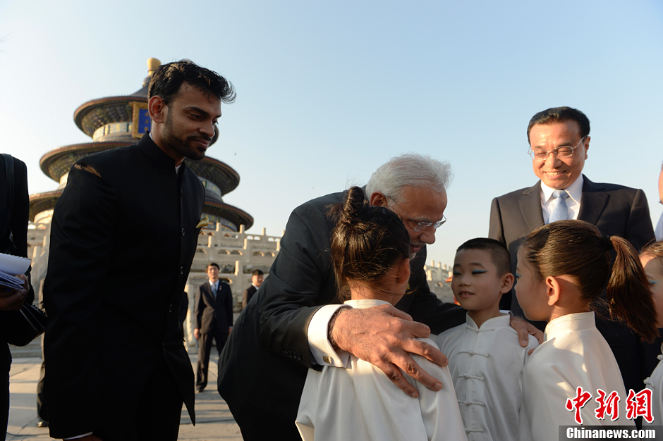 5月15日下午,李克强总理与印度总理莫迪来到天坛祈年殿前,与400多名两国太极、瑜伽爱好者交流互动并观看了演练。一个行云流水,一个柔韧舒展,太极和瑜伽这两大东方文化瑰宝交相辉映。演练结束后,李克强与莫迪共同参观了祈年殿。随后,两人沿着一条林间小路散步交谈。中新社发 廖攀 摄