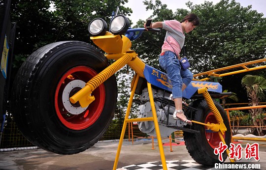 5月18日,重庆街头一辆巨型摩托车模型吸引市民“试驾”。中新社发 陈超 摄