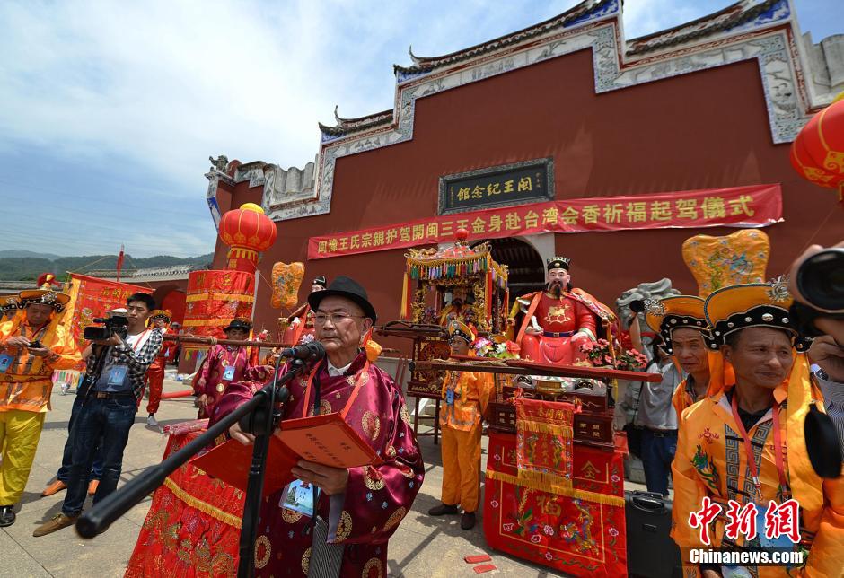 5月14日,开闽“三王”金身赴台会香巡安起驾仪式在福州举行,300名闽王宗亲后人将护驾金身渡海,往台湾中北部开展为期10天的绕境祈福活动。唐朝王潮、王审邽、王审知三兄弟被两岸民众尊为为开闽“三王”,公元885年三王从河南光州固始入闽,福建成就霸业。千年之间,闽王后人遍及海内外,目前在台湾就有近50万王审知后裔。张斌 摄