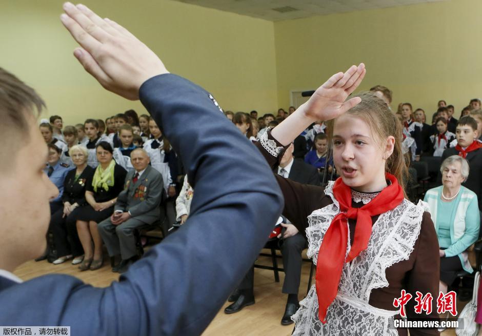 当地时间5月19日,俄罗斯西伯利亚城市克拉斯诺亚尔斯克,45名少先队队员举行入队仪式以此。据悉,当日是俄罗斯少先队成立93周年。