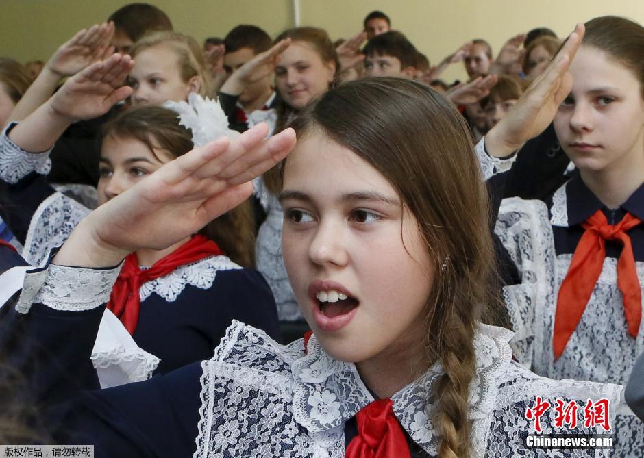 当地时间5月19日,俄罗斯西伯利亚城市克拉斯诺亚尔斯克,45名少先队队员举行入队仪式以此。据悉,当日是俄罗斯少先队成立93周年。