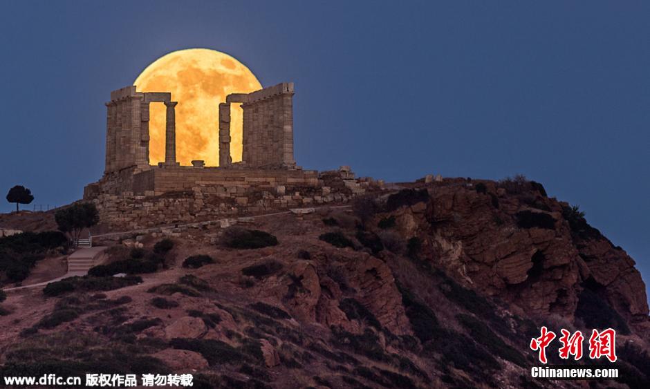 当地时间2015年5月3日报道(具体拍摄时间不详),希腊阿陀斯山,一轮金色的月亮在古希腊波塞冬的神庙上升起。艾曼诺伊里德斯在希腊阿陀斯山(Mount Athos)上用了14个小时拍摄这些惊人的照片。其中,他抓拍到2次国际空间站划过夜空的场景。还有诸如更小的卫星甚至流星雨、多重闪电、月亮升上希腊海神波塞冬神庙上空等美景,且没有加入任何电脑特技效果。