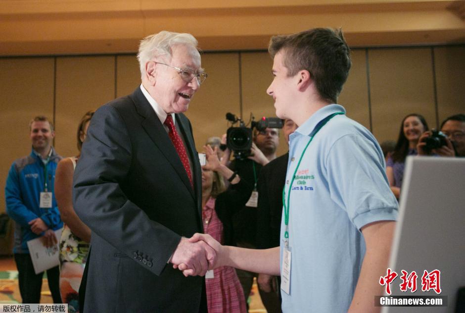 当地时间2015年5月18日,美国奥马哈,巴菲特会晤美国年度儿童创业大赛“创业成长竞赛”的决赛选手。这项竞赛已经连续第四年举行,此次吸引了超过4000名年龄在7岁和14岁儿童少年参加。这项比赛是巴菲特的“秘密百万富豪俱乐部”企划的一部分,宗旨为启发小朋友的金融知识与创业精神。