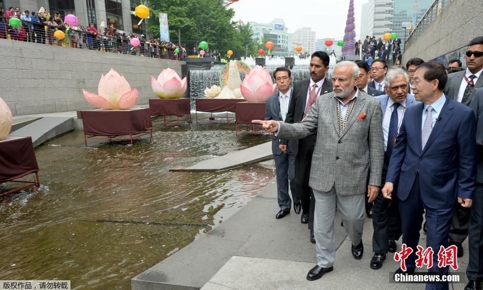 当地时间2015年5月19日,韩国首尔,印度总理莫迪前往清溪川参观,受到民众欢迎。莫迪对韩国进行为期两天的访问,以寻求投资机遇。