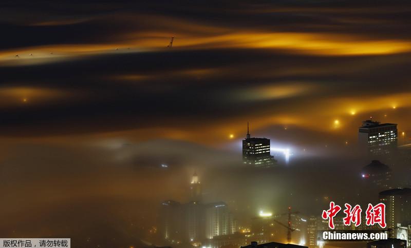 外媒今年5月19日在网上发布了这组“天空之城”的照片。上面的照片采用长时间曝光技术拍摄,拍摄时间为2012年5月,南半球即将进入冬季,南非开普敦港口的灯光在季节性的雾气中显得朦朦胧胧。