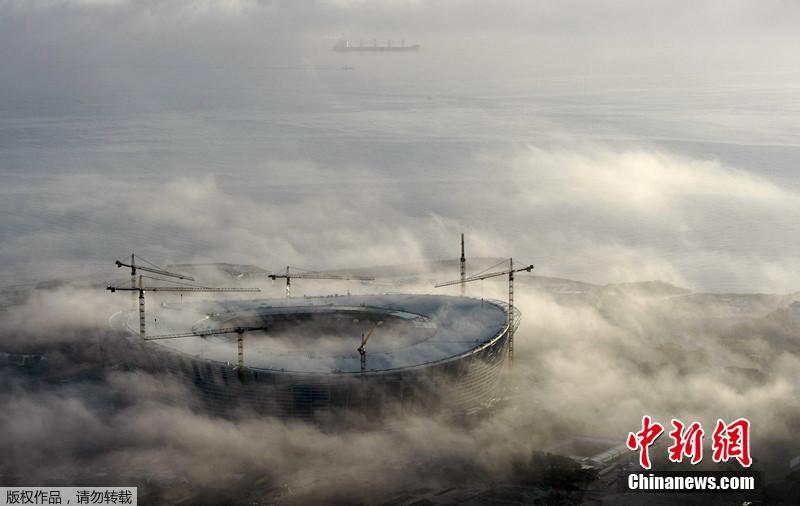 清晨,雾气笼罩着南非开普敦市绿点球场,该球场是2010年世界杯足球赛赛场之一。图片拍摄于2009年8月。