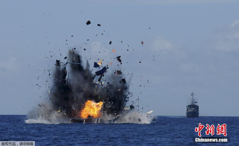 当地时间2015年5月20日,印尼北苏拉威西省,印尼海军炸沉在印尼海域非法捕鱼的外国渔船。来自越南、泰国、菲律宾的共19艘外国非法捕鱼船被印尼政府炸毁。