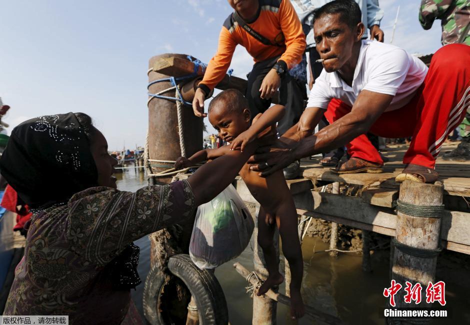 当地时间2015年5月20日,印尼亚齐省,罗兴亚族移民抵达当地Julok村。据一名印尼搜救官员称,数百名来自缅甸和孟加拉国的罗兴亚族移民在印尼西北省份亚齐省登岸。