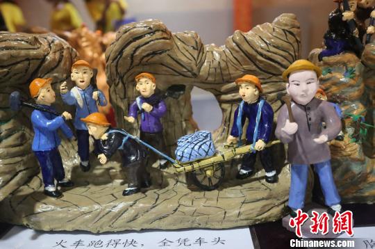 5月26日,河南安阳,71岁的林州泥塑艺人赵会文老人介绍她创作的五彩泥塑《十万大军战太行》。 杨正华 摄