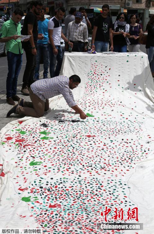 当地时间2015年5月26日,约旦河西岸拉姆安拉,民众用手指蘸上颜料绘制巴勒斯坦地区,欲打破最大彩绘巴勒斯坦地图世界纪录。