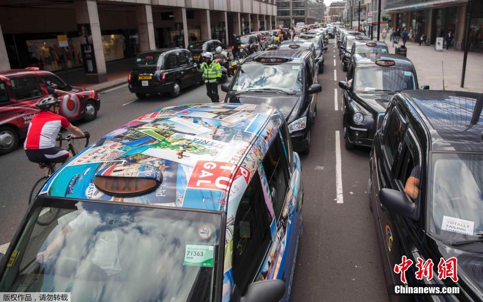 当地时间2015年5月26日,英国伦敦,伦敦黑色出租车司机在当地维多利亚大街上示威,抗议伦敦交通局政策。