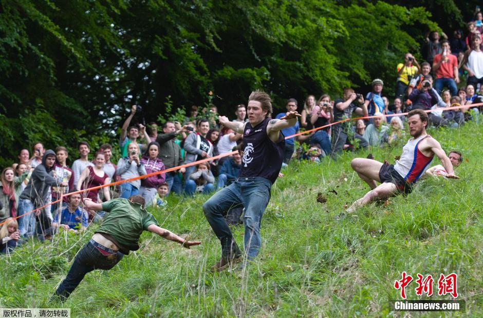 当地时间2015年5月25日,英国格罗斯特郡布洛克维尔夫,一年一度的滚乳酪大赛(Cheese Rolling)。参赛选手在比赛中追赶一个从陡坡上滚下的巨大奶酪轮,“奶酪勇士”们就算被摔断胳膊和腿也在所不惜。