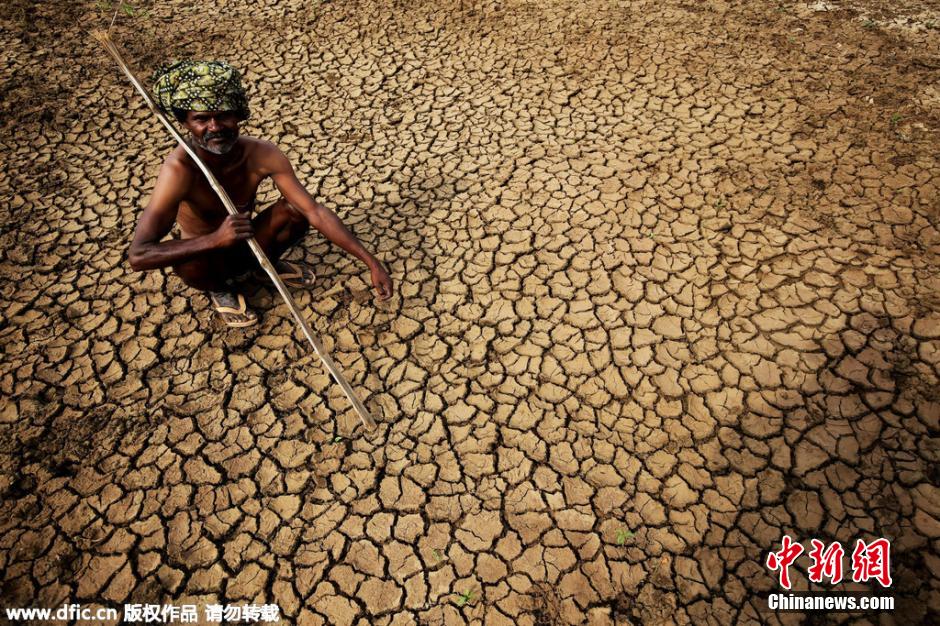 当地时间2015年5月26日,印度Doddaballapur,一名农民坐在龟裂的土地上。据媒体报道,印度部分地区高温天气导致的死亡人数已超过1000人。