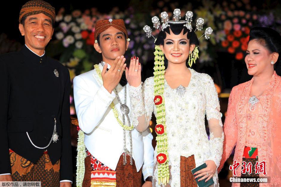 当地时间6月11日,印度尼西亚总统佐科的儿子大婚,他的长子27岁的吉布兰与26岁的席薇行过婚礼后与佐科伉俪合影。报道称,婚礼在佐科老家中爪哇省的梭罗市举行,一切按爪哇传统进行,包括婚礼前一天,新郎沐浴后由父亲背出门。