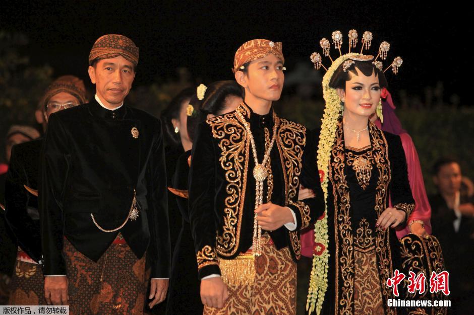 当地时间6月11日,印度尼西亚总统佐科的儿子大婚,他的长子27岁的吉布兰与26岁的席薇行过婚礼后与佐科伉俪合影。报道称,婚礼在佐科老家中爪哇省的梭罗市举行,一切按爪哇传统进行,包括婚礼前一天,新郎沐浴后由父亲背出门。