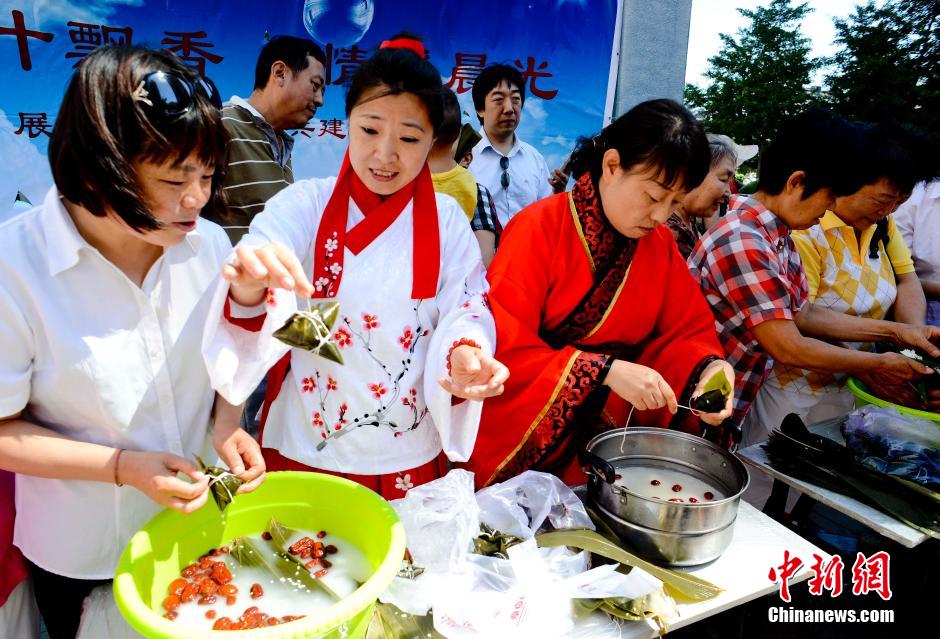 6月18日,在北京朝阳六里屯街道晨光社区一场传承民族文化的端午节系列活动拉开帷幕。穿汉服学礼仪、爱国主义诗歌朗诵会、包粽子大赛等等系列活动,让社区居民在欢笑中深入的了解了中国博大精深的民族传统文化。图为来自晨光社区的居民穿着汉服比赛包粽子。中新社发 陆欣 摄