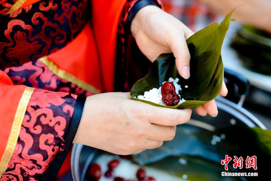 6月18日,在北京朝阳六里屯街道晨光社区一场传承民族文化的端午节系列活动拉开帷幕。穿汉服学礼仪、爱国主义诗歌朗诵会、包粽子大赛等等系列活动,让社区居民在欢笑中深入的了解了中国博大精深的民族传统文化。图为来自晨光社区的居民穿着汉服比赛包粽子。中新社发 陆欣 摄