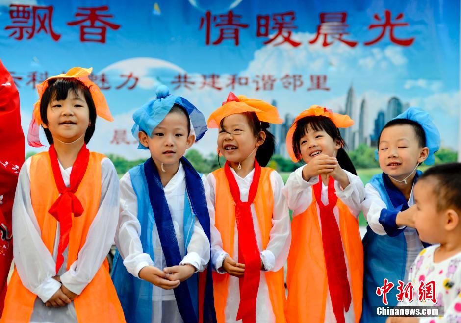 6月18日,在北京朝阳六里屯街道晨光社区,一场传承民族文化的端午节系列活动拉开帷幕,来自晨光小学的孩子们穿着汉服学习传统礼仪。中新社发 陆欣 摄