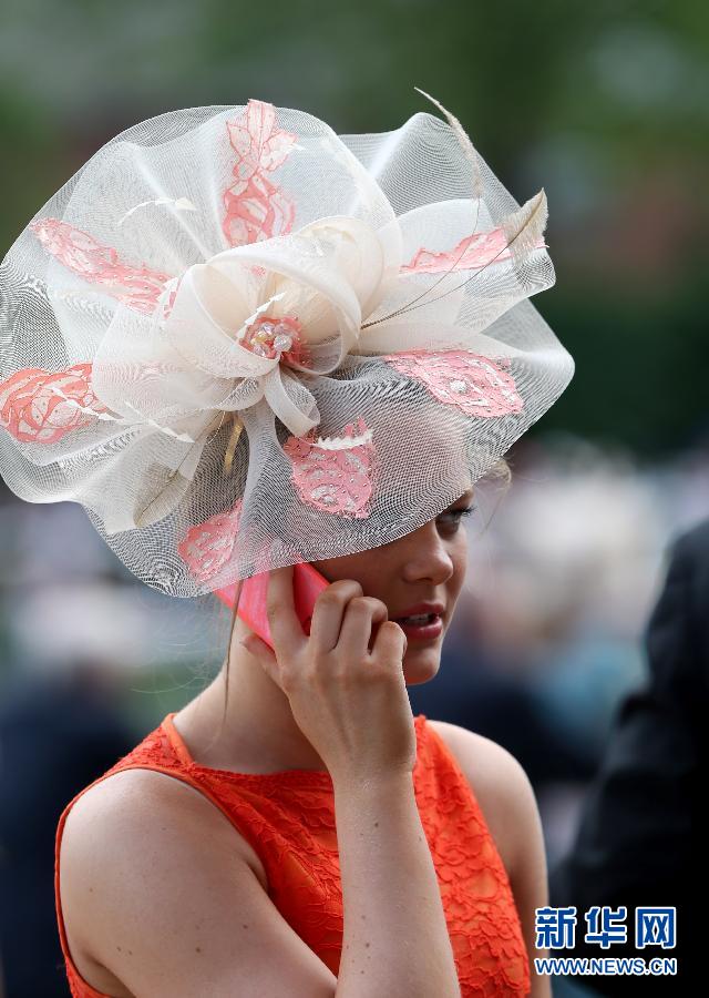 6月17日,在英国阿斯科特,一名女士头戴造型奇特的帽子出席赛马会。 当日,在伦敦附近的阿斯科特举行的2015英国皇家赛马会进入第二天。新华社记者韩岩摄