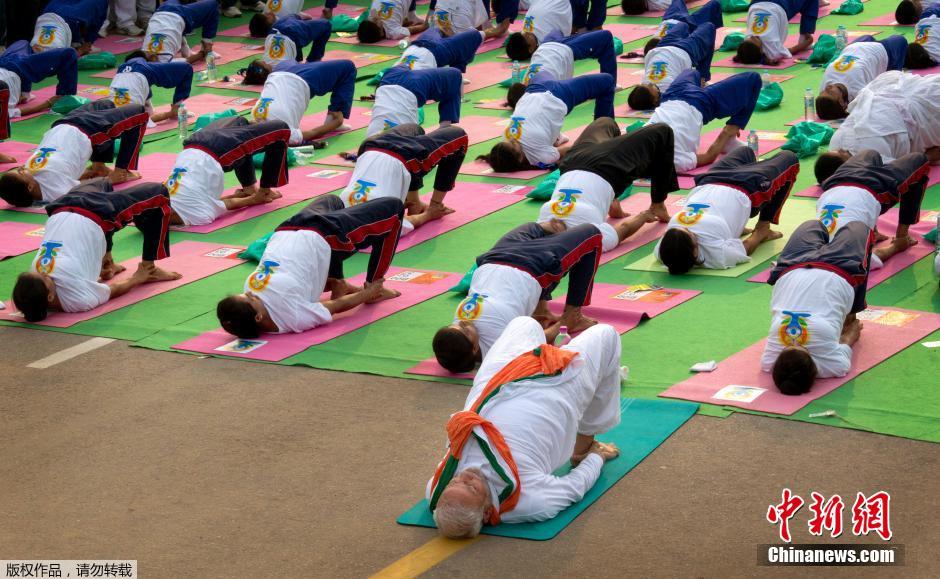 当地时间2015年6月21日,印度新德里,数万印度人在总理莫迪的带领下做瑜伽操,庆祝首个国际瑜伽日。印度官员称,这一数字创下新的吉尼斯纪录。