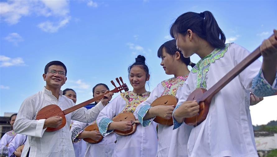 6月19日,贵州省黔东南苗族侗族自治州榕江县乐里中学,老师在教学生弹唱侗族琵琶歌。 近年来,贵州省黔东南苗族侗族自治州榕江县各民族学校积极开展“民族民间文化进课堂”活动,开设侗族琵琶歌、瑶族歌舞、水族芦笙、苗族腊染等传承班,既让学生们在富有民族特色的教学中快乐学习,又使民族文化在校园里得到传承。 新华社发(蒋佐仙 摄)
