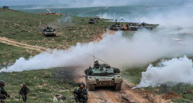 在“跨越-2016·朱日和A”演习中,红军参演部队步兵和坦克协同作战(2016年7月19日摄)。新华社发(王佳寅 摄)