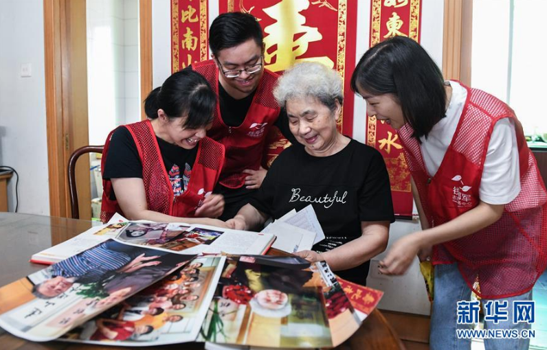 83岁的劳模教师顾月英(右二)向志愿者们讲述当年的教师生涯(9月3日摄)。 新华社记者 徐昱 摄