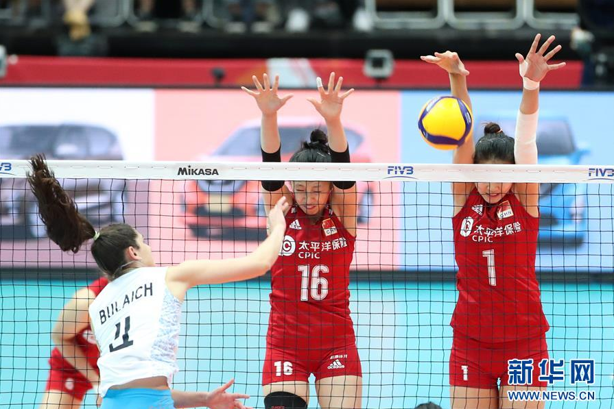 9月29日,中国队球员袁心玥(右)和丁霞(中)在比赛拦网。新华社记者杜潇逸摄