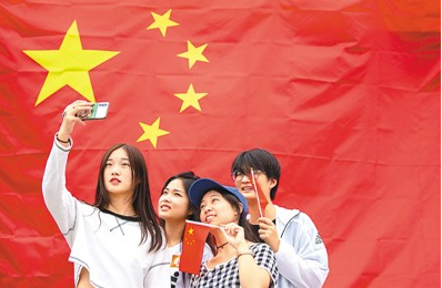 9月11日,人们在江苏省泰州市望海楼景区与国旗合影。汤德宏摄(人民视觉)