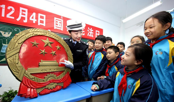 2019年12月3日,在第六个“国家宪法日”到来之际,山东省枣庄市公安局峄城分局交警大队一名交警在荀子小学为学生们普及宪法知识。图片来源:人民网