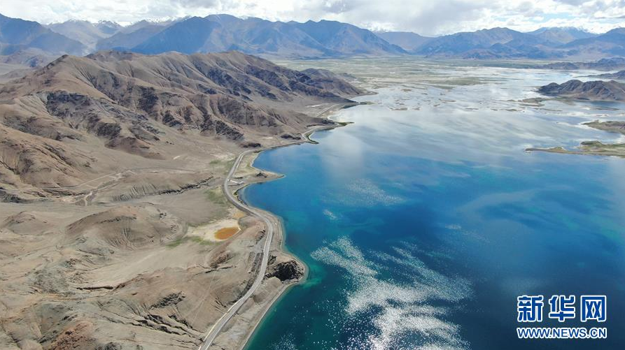 2019年8月3日拍摄的位于西藏阿里地区境内的班公湖畔的公路(无人机照片)。 近年来,西藏全面推进“四好农村路”建设,5年来新改建农村公路4.34万公里,解决了233个乡镇、2276个建制村通硬化路。 新华社记者 晋美多吉 摄