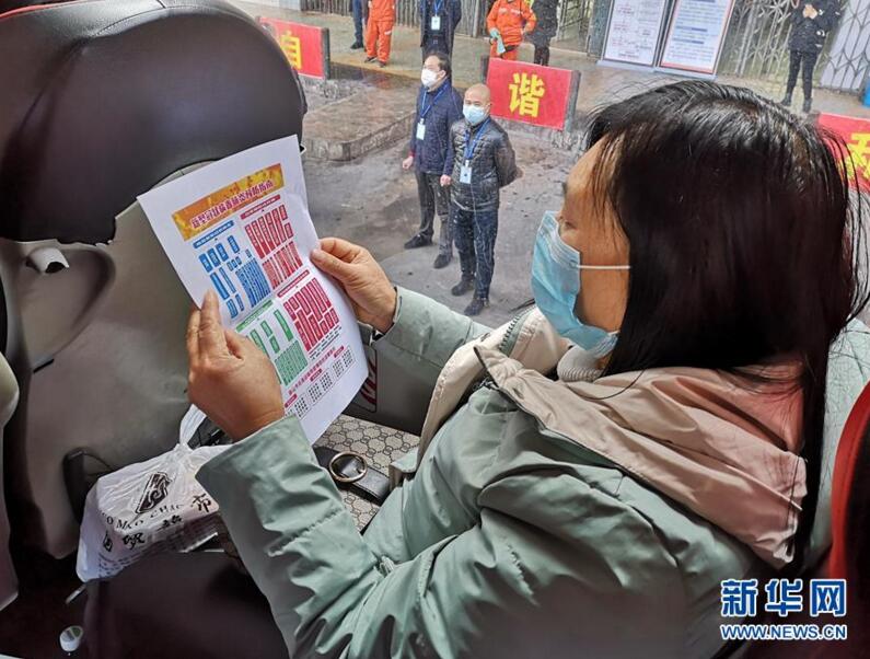 在四川仁寿联营汽车客运站,一名农民工在车上阅读统一发放的新冠肺炎预防指南(2月11日摄)。 新华社记者胡旭摄