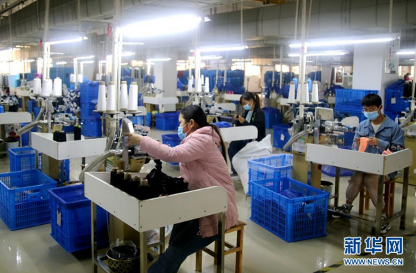 3月24日,在湖北省十堰市郧阳区杨溪铺镇青龙泉社区棉伙棉伴智能袜业扶贫车间,工人在加工袜子。新华社发(曹忠宏 摄)