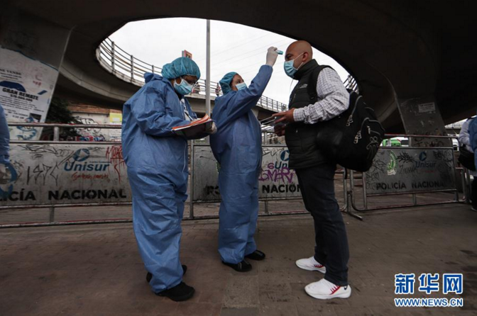 4月2日,在哥伦比亚小城索阿查,医务人员为行人测量体温。 美国约翰斯·霍普金斯大学2日发布的最新统计数据显示,全球新冠肺炎确诊病例累计超过100万例。 新华社发(约翰·帕斯摄)