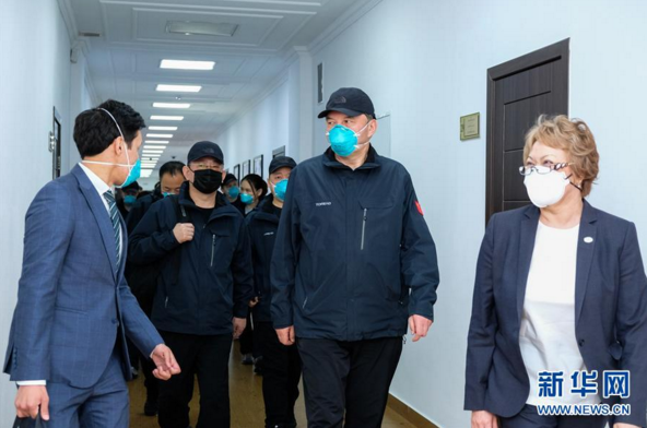 4月16日,中国援哈医疗队在哈萨克斯坦中部城市卡拉干达访问卡拉干达州立医科大学。 中国援哈萨克斯坦医疗队日前到访哈萨克斯坦中部城市卡拉干达,与当地医疗机构和专家开展经验分享和交流工作,介绍中国抗疫经验。 新华社发(卡拉干达州立医科大学供图)