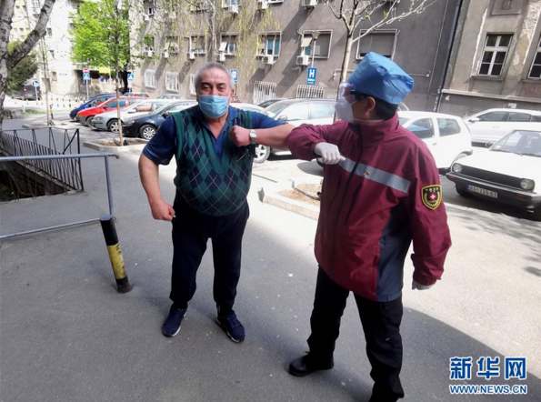 4月11日,在塞尔维亚首都贝尔格莱德,一名当地居民和中国赴塞尔维亚抗疫医疗专家组组长彭志强(右)“碰肘”致意。 新华社发(中国赴塞尔维亚抗疫医疗专家组供图)