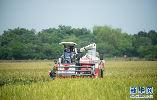 4月27日,海口市琼山区云龙镇的农民在驾驶机械收割早稻。 近期,海南省海口市种植的早稻陆续成熟,当地农民抢抓农时进行收割。 新华社发 (张丽芸 摄)