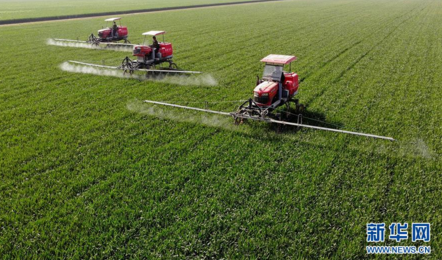 4月28日,南和县闫里乡闫里村一农业合作社农民使用农业机械在麦田喷洒农药(无人机照片)。 眼下正值冬小麦中期管护关键时期,河北省南和县农民抢抓农时进行“一喷三防”作业,确保夏粮丰收。 新华社发(朱旭东 摄)