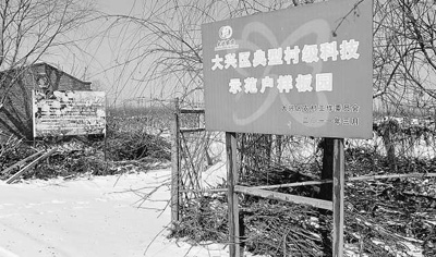 大兴区农工委授予八家村梨园“样板园”匾牌立在梨园大门口。本报记者 江山摄